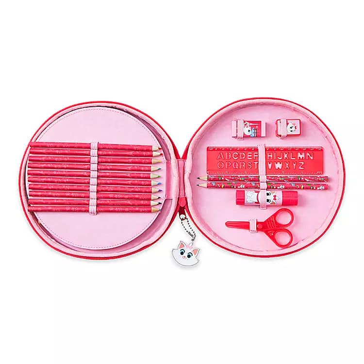 Set Includes: 10 markers, 10 colored pencils, two pencils, ballpoint pen, eraser, sharpener, ruler, scissors, glue stick, notepad, moulded soft padded case, two separate compartments with zip closure, and rubber Marie zip pull charm.
