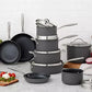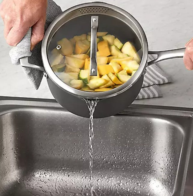 The complete 15-piece set of pots and pans has everything you need for nearly every recipe. The aluminum body is coated with a nonstick interior, while the outside is hard anodized. All the pans include glass lids, except the 8", 10" and 12" saute pans. The saucepan lids have straining holes and pour spouts. All handles are stainless-steel casting handles.